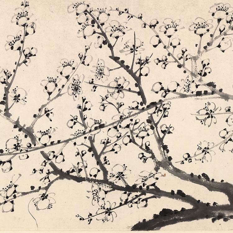 一株老梅,如蟠曲游动的蛟龙,自画幅中部向左右延展。老干淡而老苍,细枝柔而劲挺,笔墨圆浑,气息内敛。