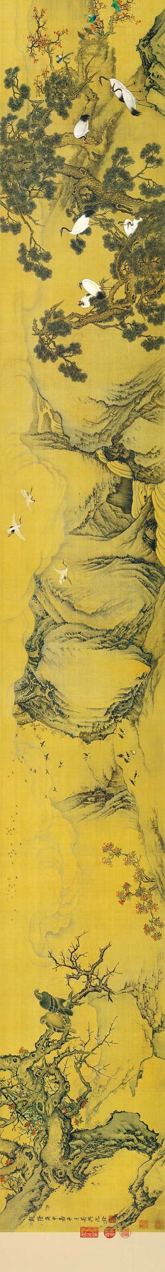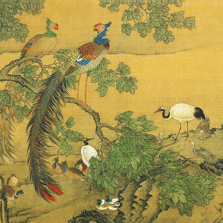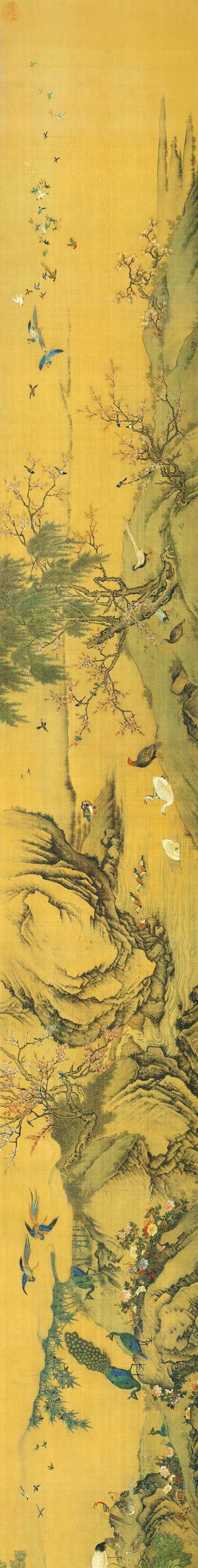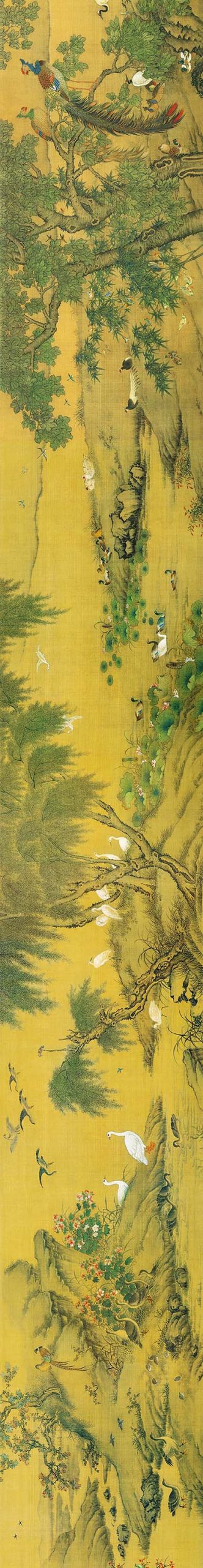 作品以四季自然景观为背景,描绘近300种禽鸟栖息于松柏、梧桐等植物间的场景,中心以双凤象征吉祥神鸟,融合工笔、写意、没骨等多种技法形成精丽画风。创作于乾隆五年(1740年),通过百鸟朝凤意象隐喻国泰民安,松鹤延年、喜鹊登枝等元素构成完整的吉祥寓意体系。其写实程度堪比生物图谱,单幅画面既可独立成景,整体构图又呈现疏密有序的四季转换
