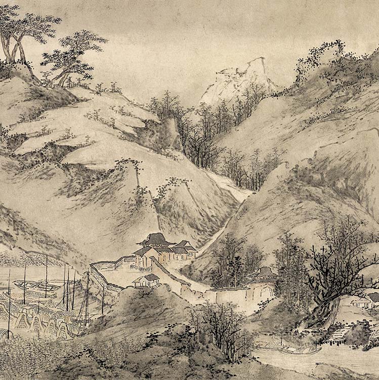 吴宏 ( 1615 -1680 )江西金溪人。移居江宁(今南京)。宏,一作弘,字远度,号竹史、西江外史。清初著名画家。自幼好绘事,自辟蹊径。顺治十年(1653)曾渡黄河,游雪苑,归而笔墨一变,纵横放逸。画作大多取材于自然景物及仰慕的桃花源仙境,构图疏密相间,气势雄阔。与龚贤、高岑、樊圻、邹喆、叶欣、胡慥、谢荪合称为“金陵八家”,在八家中画风最为粗放,浑融无际,任凭想象,景色细致苍郁,充满了生活气息。偶作竹石,亦有水墨淋漓之致。周亮工赠诗云:“幕外青霞自卷舒,依君只似住村虚,枯桐已碎犹为客,妙画通神独亦予”。传世作品有康熙五年(1666)作《山水》册页、《江山行旅图》卷;十一年(1672)作《松溪草堂图》轴、《竹石图》轴;《山村樵牧图》轴。
