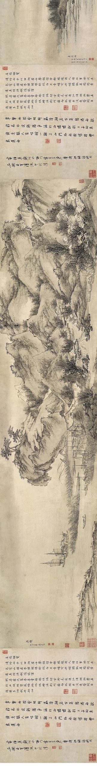 这幅画描绘的燕子矶是南京的名胜。画面上江水与山石相连,渔船停泊在偏僻的港湾,天色傍晚,江水微波,烟雾迷朦的莫愁湖景象。莫愁湖内笼罩着轻纱般的云雾,岸边树木葱茏,使画面富有浓厚的生活气息。