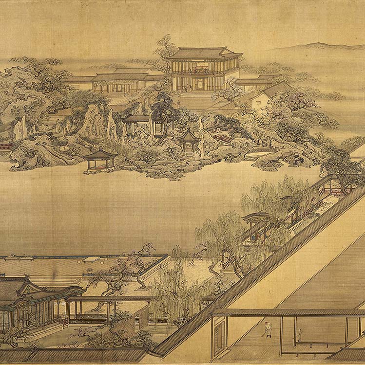 袁江(1671?-1746?),清代画家,字文涛,晚年号岫泉,江苏江都人。雍正时,召入宫廷为祗侯。袁江主要活动于民间。是职业画家,长时间在扬州和江浙一带活动。他擅画山水楼阁,早年师法仇英,中年对古代作品尤其是宋代的山水画作过细心地摹绘。绘画技艺大增。其画传流功力深厚,尤其继承青绿山水传统,所作青绿山水,浑朴有致。中年“得无名氏所临古人画稿,技遂大进”。他将雄伟壮阔的山色与富丽堂皇的楼阁,很好地融为一体,既精细入微,又气势磅礴,有力地提高了“界画”的表现能力,被推为清代“界画”第一。袁江存世作品较多,多在国内收藏,也有一些流到海外。天津市文管处收有一幅《瞻园图卷》,表现南京的园林建筑;上海博物馆藏有一幅《东园图卷》;北京文物局收有《骊山避暑图轴》,表现想象中的仙境;南京博物院藏有《海山三山图轴》,也描绘了想象中的仙境和古代建筑,瑰丽壮观,富有意境。