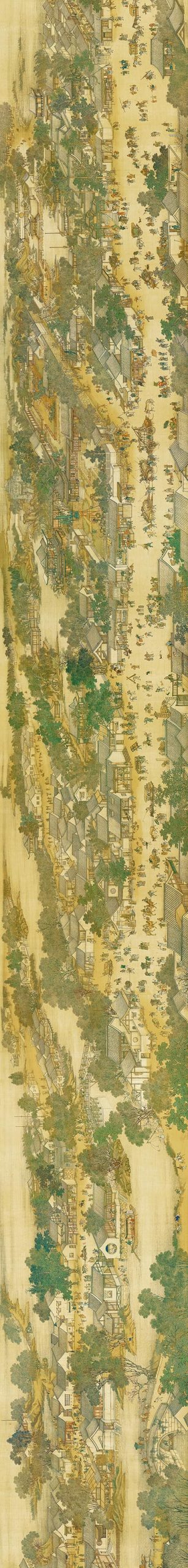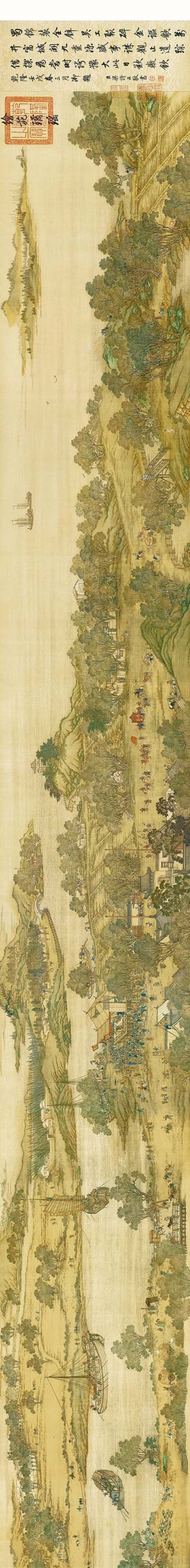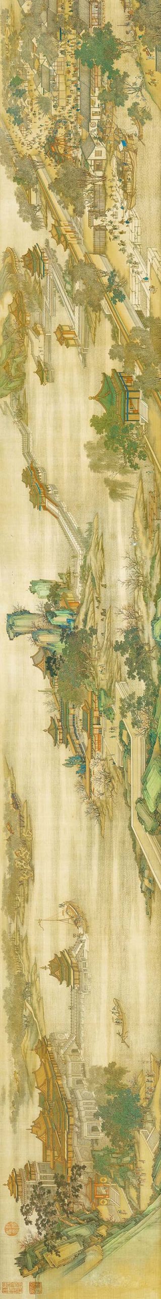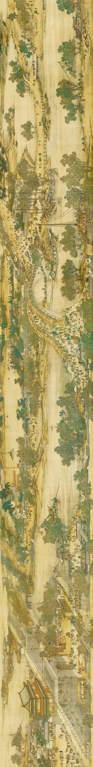 《清明上河图》是清宫画院的五位画家陈枚、孙祜、金昆、戴洪、程志道于1736年(乾隆元年)合作画成的绢本设色画,现藏于台北故宫博物院。