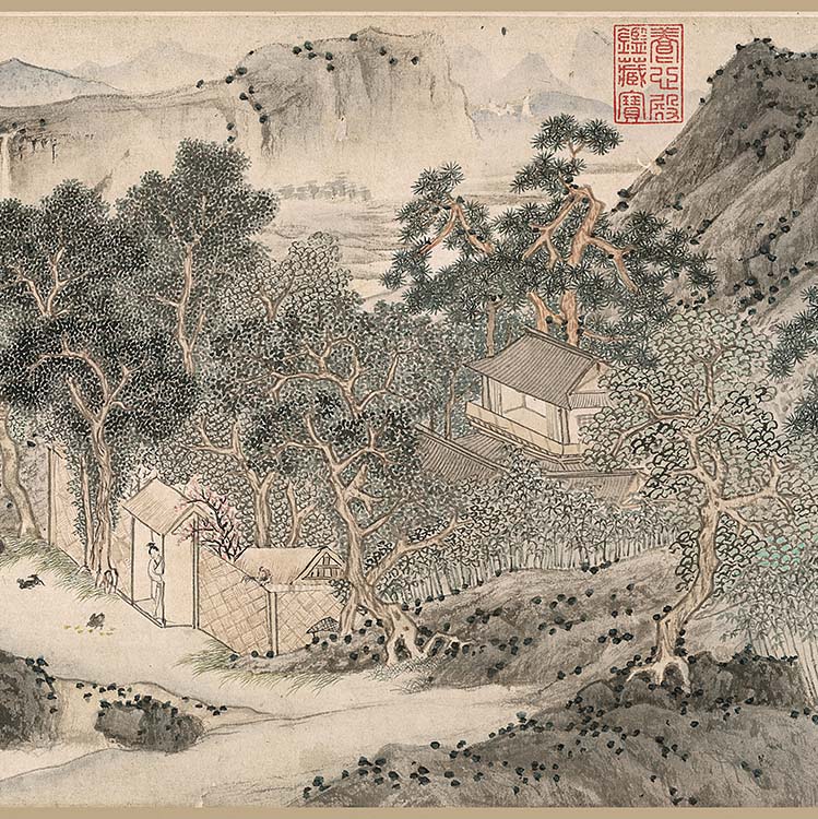 《桃源问津图》全图画远山冈峦,叠翠连绵,溪水横流,树木葱郁,屋舍村字,掩映其间,有老者山道边策杖观瀑沉思,有妇人携幼拄杖于院篱门口问路,屋内四男子席地而坐,饮酒高谈。图中线条粗细旋转富于变化,墨色浓淡干湿,层次丰富。