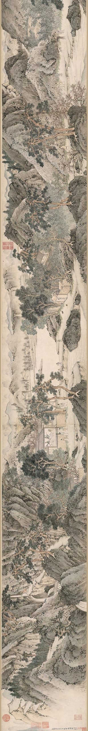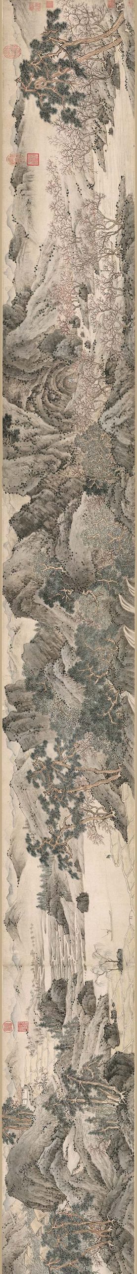 渔人在长卷中多次出现,均是青衣白裤、手持船桨的形象。此图名为“桃源”,实以吴中山水入画。全图人物、景致繁多,画法较为写实。山石施以披麻皴,焦墨点苔,用笔洒脱而不荒率;树干勾染并施,苍劲朴拙,夹、点作叶,极富生机。