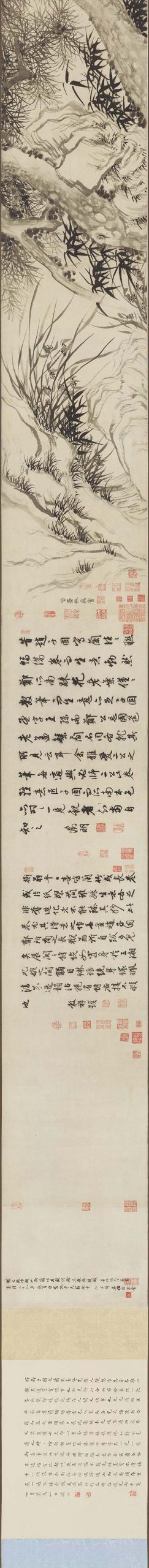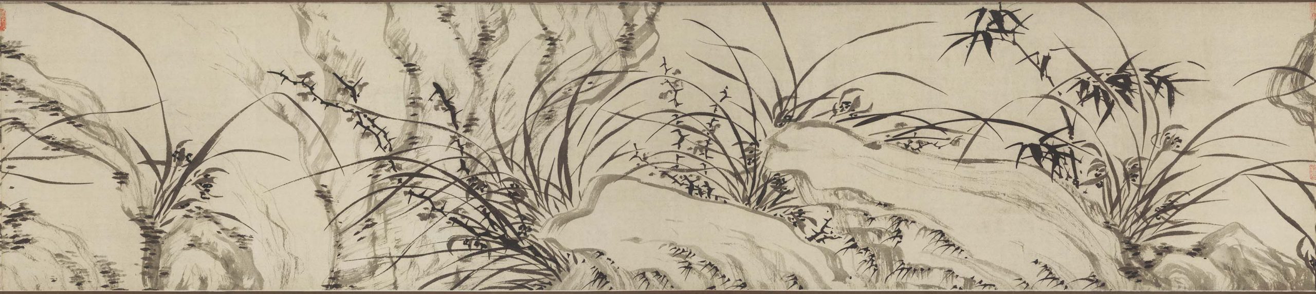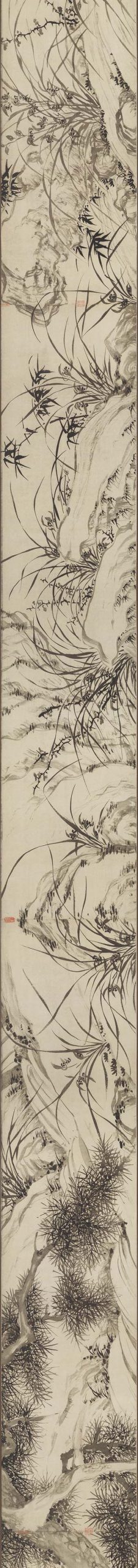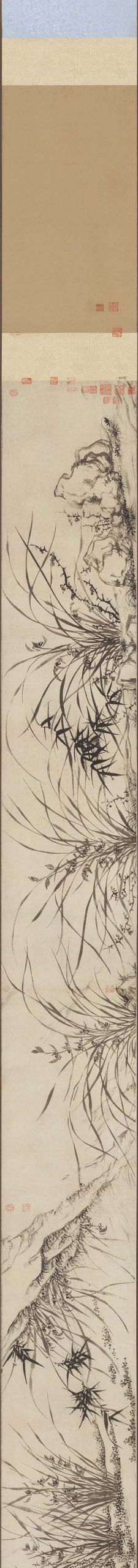全图以兰竹、山石为题材,并以兰花为主体层层展开。每丛兰花随意点簇,穿插有致,疏散俏丽,各丛兰花有粗有细,有挺有转,有断有续,有收有放,变化多端,各呈姿态,毫无雷同之感,更无败笔多余之处。文徵明更是巧妙地融入了山水画的意境,将怪石、古松、劲草、洲渚陂陀穿插其间,因宜配景,错落有致,合情合理。
