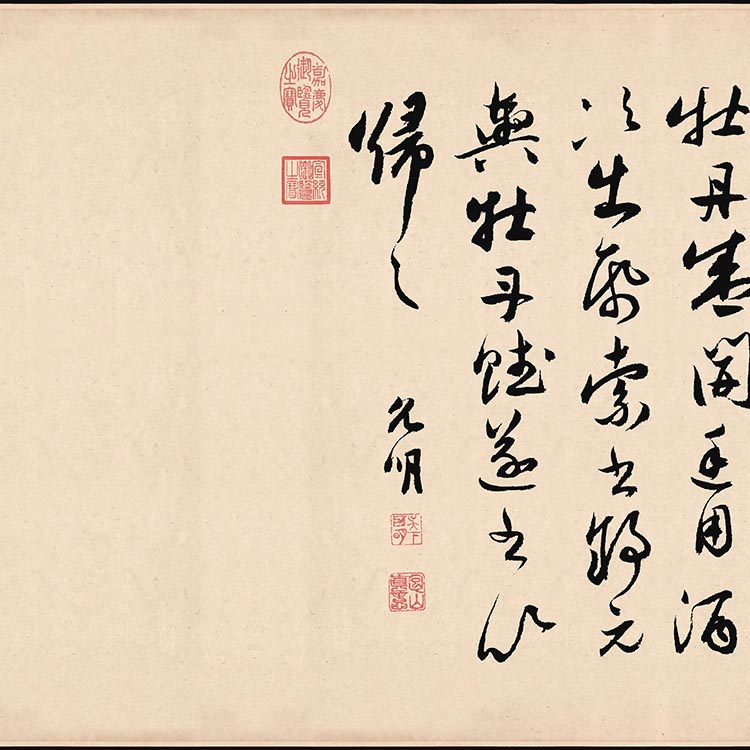 该卷乃是应友人之请,书写唐舒元舆所撰的文学名篇《牡丹赋》。时在嘉靖甲申(1524 年)三月十五日,祝允明六十五岁。此卷现由故宫博物院收藏,纵 30.6 厘米,横 529.6 厘米,还钤有 “昌伯所得” 藏印一方。