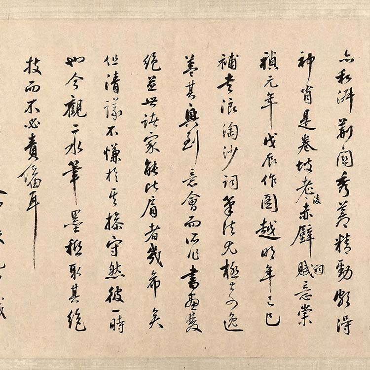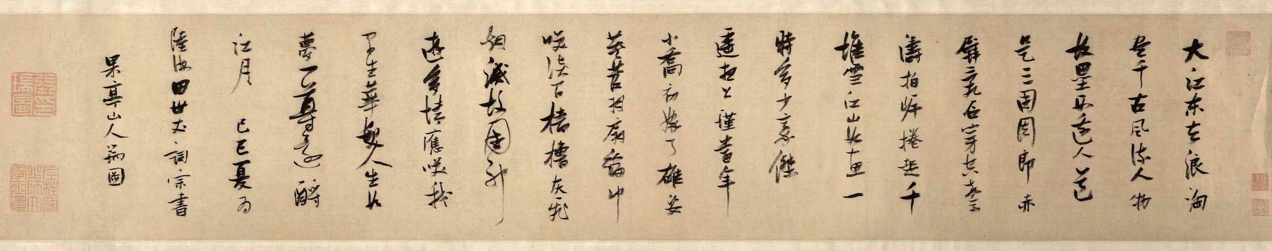 台北故宫博物院所藏其草书手卷《后赤壁赋》(天启丁卯年作),堪称其书风变革的里程碑式呈现。此卷书苏轼名篇,在笔法、章法、结体皆彰显出对元明传统的锐意突破,一扫柔媚时风,以方硬奇崛之姿重释草书。
