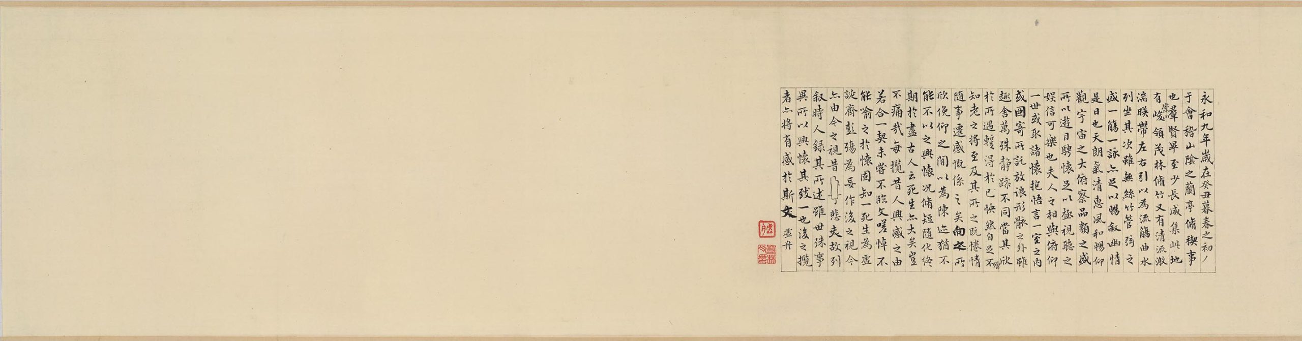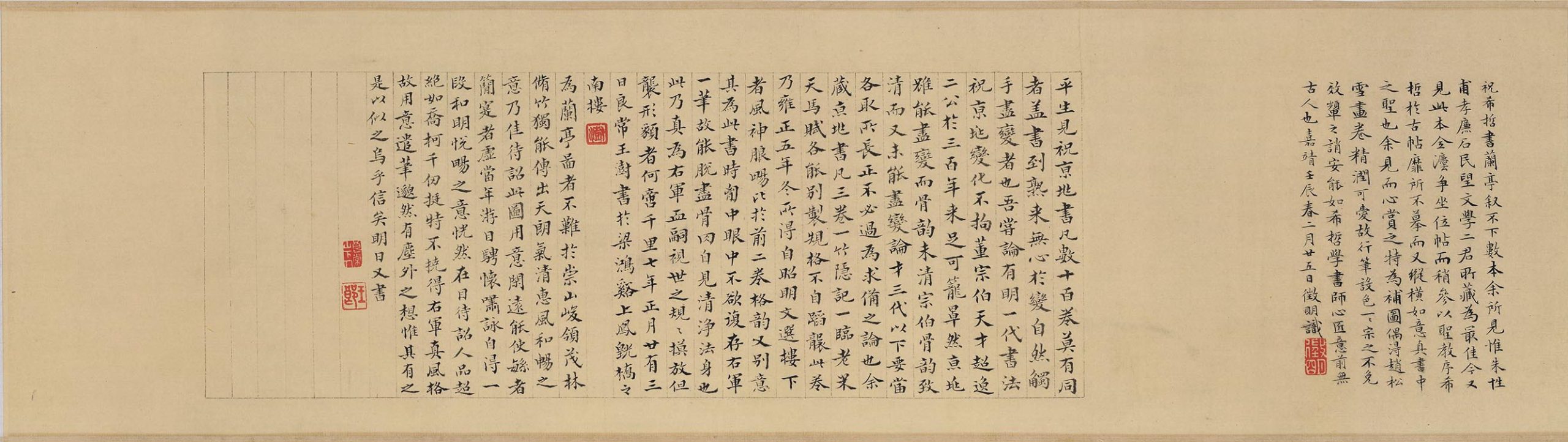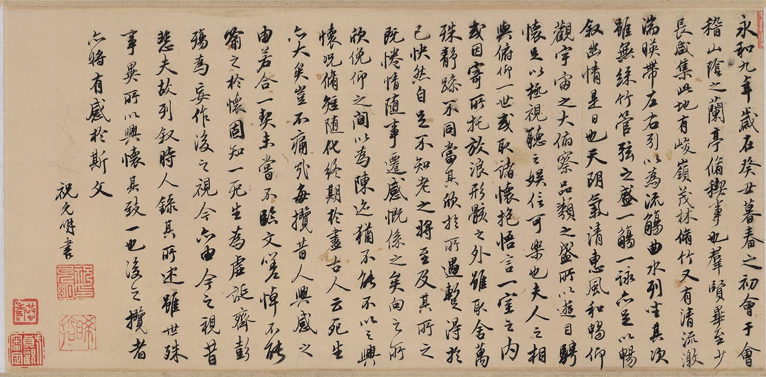 此件可谓至宝,通篇能窥见晋人书法面目,堪称教科书般临帖作品,本卷后有文徵明为之补图,乃书画合璧作品。祝氏书法宽博雄放,尤具自家风神。文氏题跋,并补图画王羲之等人兰亭修契之事,设色雅丽,笔墨娴熟,现藏辽宁省博物馆。