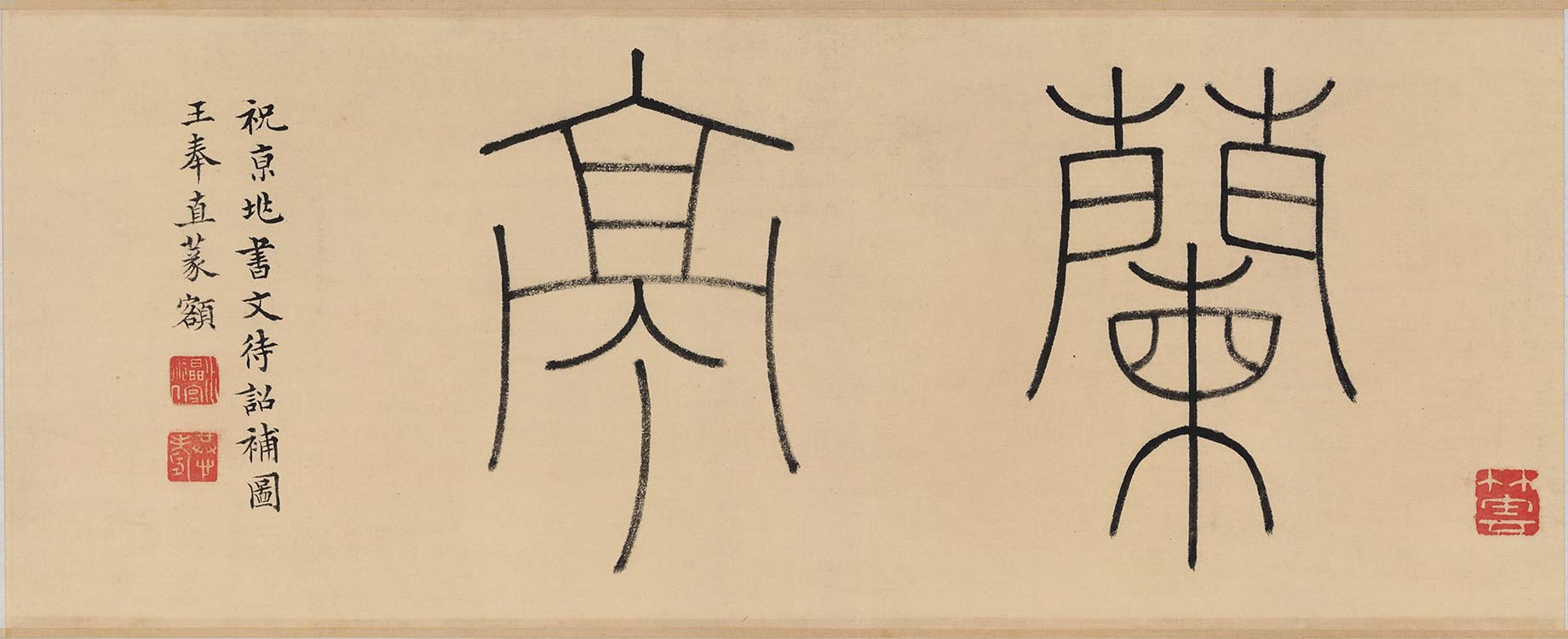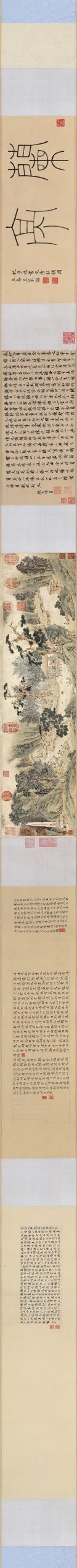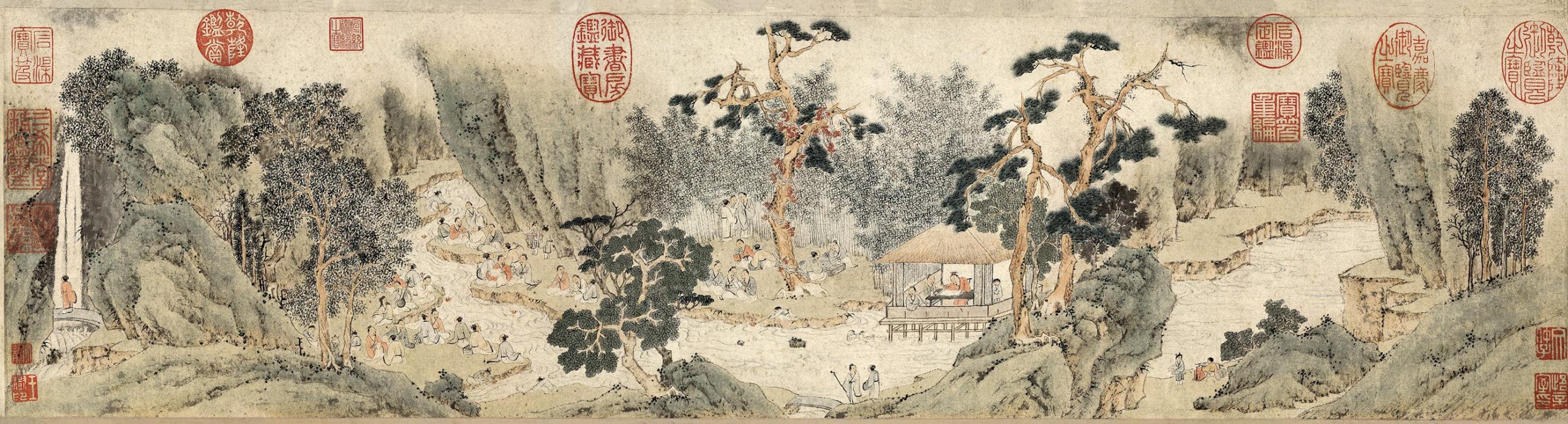 此件可谓至宝,通篇能窥见晋人书法面目,堪称教科书般临帖作品,本卷后有文徵明为之补图,乃书画合璧作品。祝氏书法宽博雄放,尤具自家风神。文氏题跋,并补图画王羲之等人兰亭修契之事,设色雅丽,笔墨娴熟,现藏辽宁省博物馆。