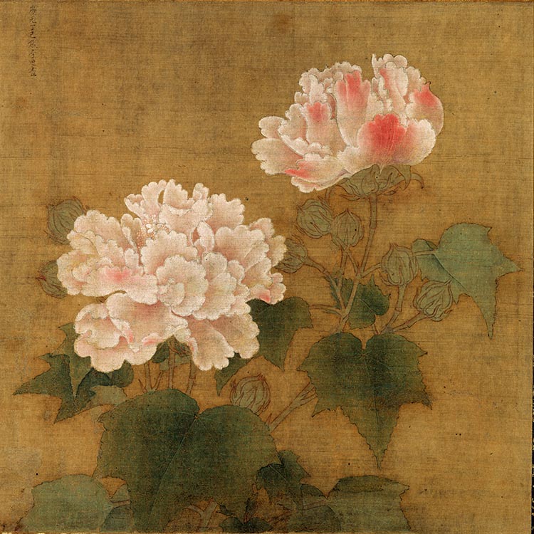 《红白芙蓉图》绘醉芙蓉倚风扶醉的娇媚之态,被日本奉为“国宝”。画中白芙蓉乃拂晓初开、晓妆未竟之景,莹白含碧、温润如玉;红芙蓉则是午时花瓣由白转红之态,粉面含春、风姿艳丽。若将两帧芙蓉并陈,则花枝偃仰呼应,花朵彼此顾盼。花光摇荡,似云霞散绮;枝叶飘逸,若翩然起舞。在时隔近千年的今天,依然清姿雅质、绰约动人。