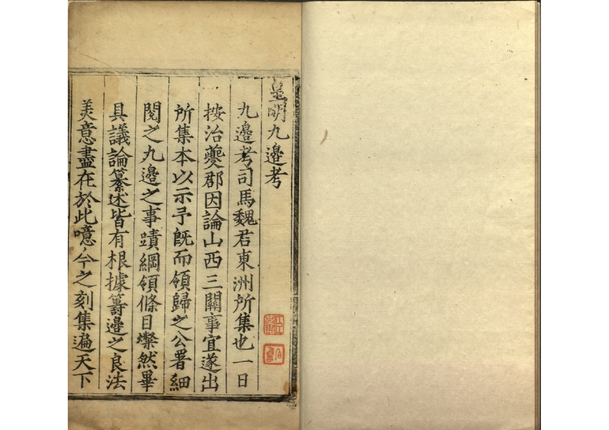 《皇明九边考》:明魏焕著。《皇明九边考》又名《九边图考》,卷一为“镇戌”、“细略”、“番夷”诸通考。以下九边为九卷,各边分疆域、责任、军马、钱粮、边夷、细略等七条,详叙其建制沿革、战守防御及沿边各民族部落内情,各卷均附地图。约刊于嘉靖二十一年(1542年)后,有《明辨斋丛书》本,民国二十五年(1936年)《国立北平图书馆善本丛书》本等。乾隆年间奏准毁禁。