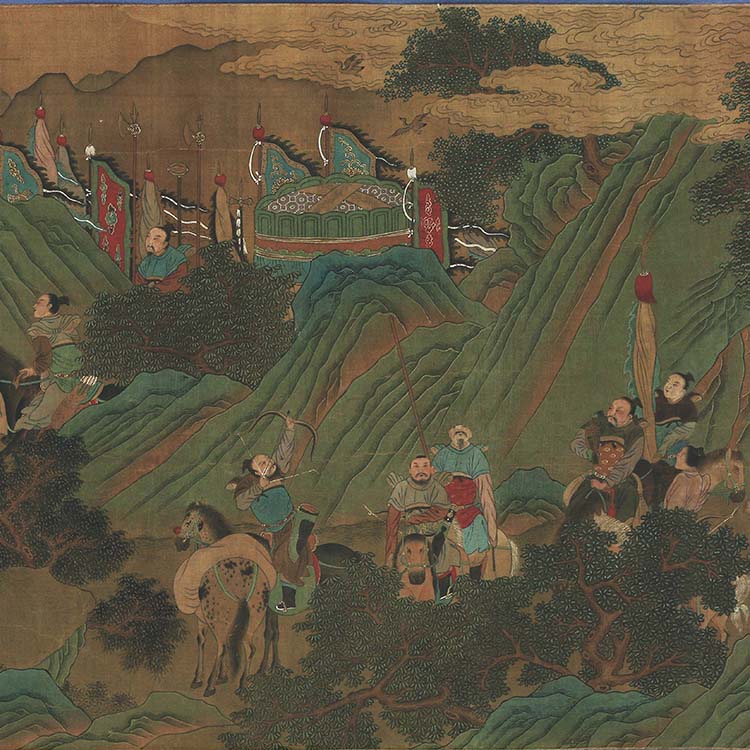 《渭水飞熊图》 绢本设色,30x384cm,早稻田大学图书馆藏。图描绘一典故:西伯侯夜梦一虎肋生双翼,来至殿下,周公解梦谓“虎生双翼为飞熊”必得贤人,后果得贤人姜尚,当时姜尚正在渭水之滨垂钓。后因以“飞熊”指君主得贤的征兆。姜太公姓姜,名尚,字子牙,道号飞熊。