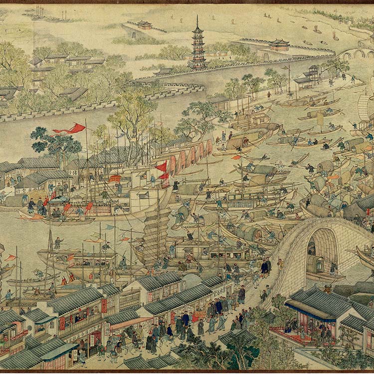 《姑苏繁华图》以长卷形式和散点透视技法,描绘了当时苏州“商贾辐辏,百货骈阗”的市井风情。