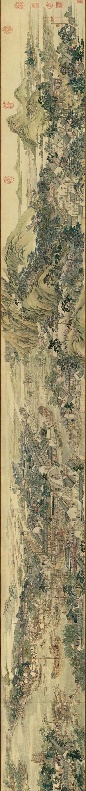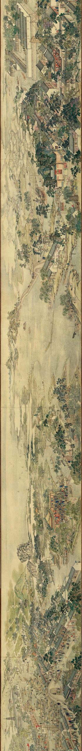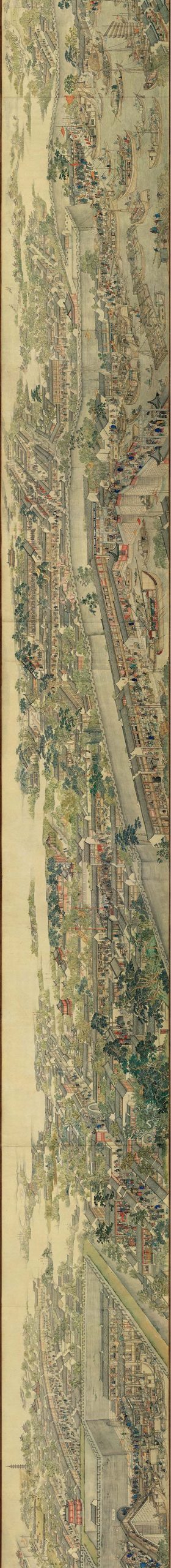 《姑苏繁华图》,全长十二米多,画面“自灵岩山起,由木渎镇东行,过横山,渡石湖,历上方山,介狮和两山之间,入姑苏郡城,自葑、盘、胥三门出阊门外,转山塘桥,至虎丘山止”。据统计,画中约有一万两千余人,近四百只船,五十多座桥,二百多家店铺,两千多栋房屋。