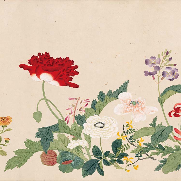 清 钱维城 万有同春图卷 波士顿美术馆藏 钱维城,字宗磐,清乾隆十年状元,官至刑部侍郎,谥号文敏,其绘画中蕴含董邦达之笔意。 此卷《万有同春图 》用无骨法绘折枝花卉约五十种,春有桃花,夏有牡丹,秋有菊,冬有梅,花开艳丽。勾勒精细,设色鲜艳,繁而不乱。 清 钱维城 万有同春图卷 局部