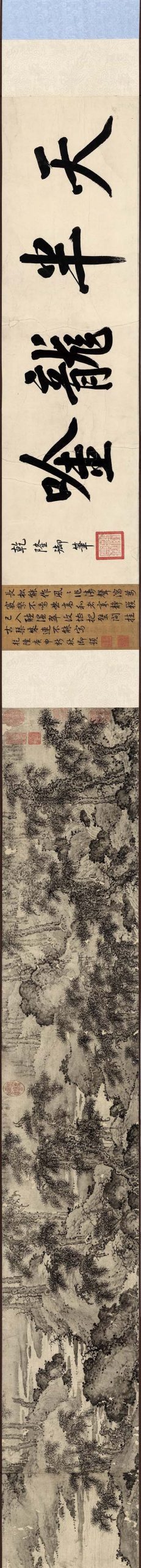 《万壑秋涛图》是明代宫廷画家何浩的传世代表作,现存两卷分别收藏于广东省博物馆与辽宁省博物馆。广东省博物馆藏本为绢本墨笔,纵27.5厘米、横493.5厘米,卷首题识含’仁智殿’和’五羊何浩’字样,印证作者宫廷画师身份,该作系2008年以80万元购得的清宫旧藏文物。辽宁省博物馆藏本纵27厘米、横493.5厘米,运用三段式构图展现古松云海的动态意境。两卷共同构成研究明代宫廷山水画的重要实物,其中粤博本为内地公立机构唯一收藏的何浩真迹