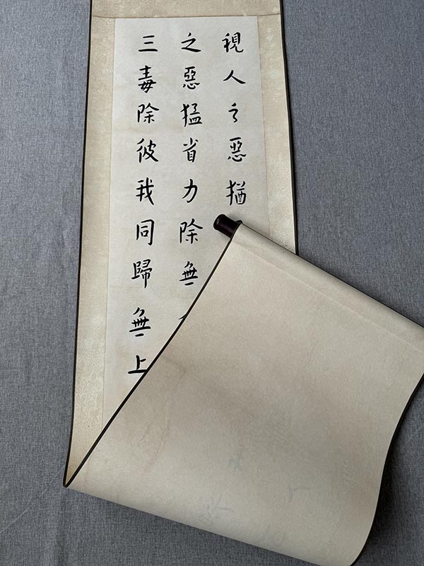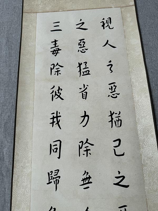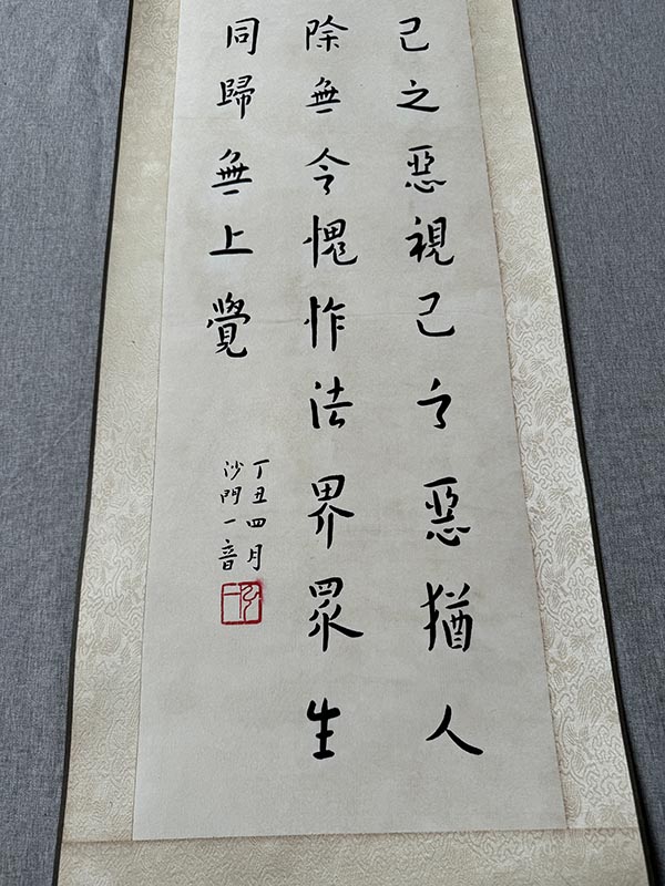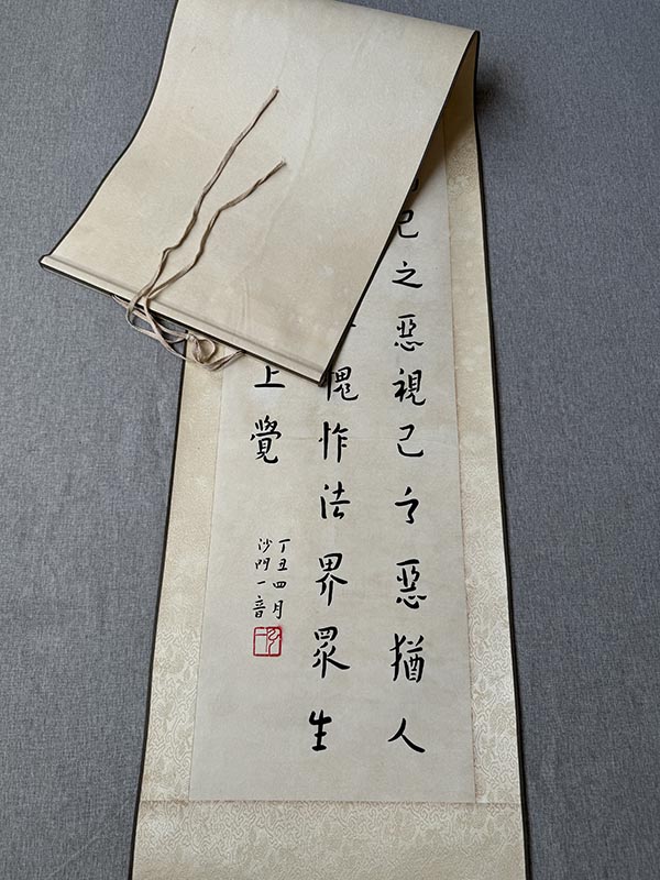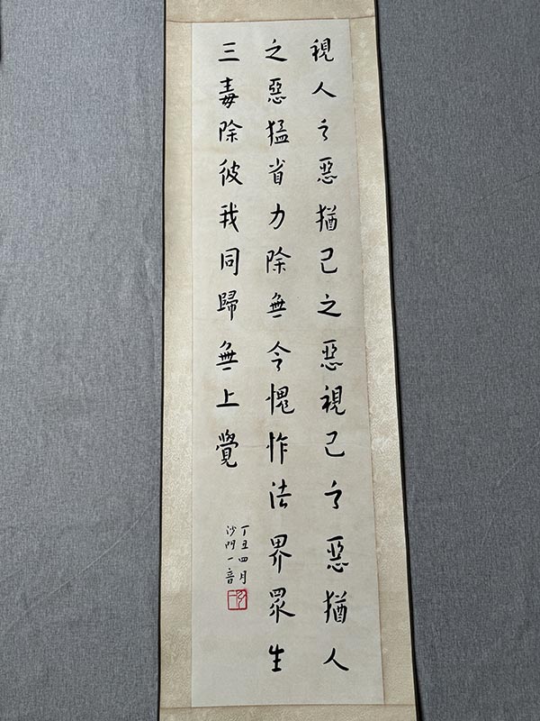 书法作品,品相完好。宣纸手写,楷书字体,笔力遒劲有力。整体尺寸38*185厘米,画心29×114厘米。弘一法师款书法卷轴,尺寸大气,装裱精美。收藏级的老字画,适合茶室、书房悬挂,送礼自用都很不错。喜欢的朋友可以直接拍下付款,24小时内发货,大陆地区顺丰包邮。