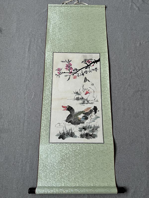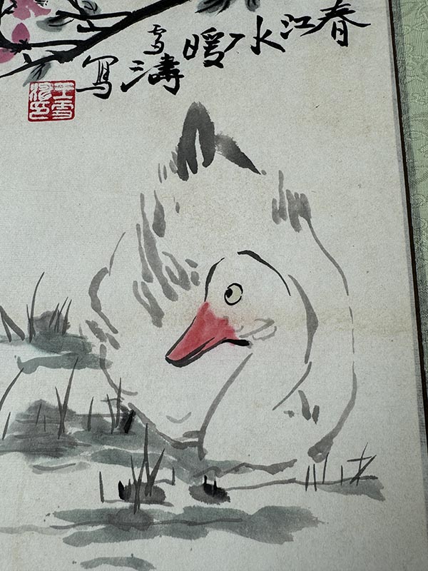 国画花鸟画立轴挂画王雪涛款春江水暖鸭先知。整体尺寸宽约46厘米,高度约135厘米(画心尺寸约33*63厘米)卷轴装裱,品相完好无瑕疵。